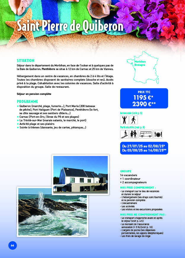 SAINT JEAN DE QUIBERON 2390 € 14 vacanciers Séjours à la mer Voir plus