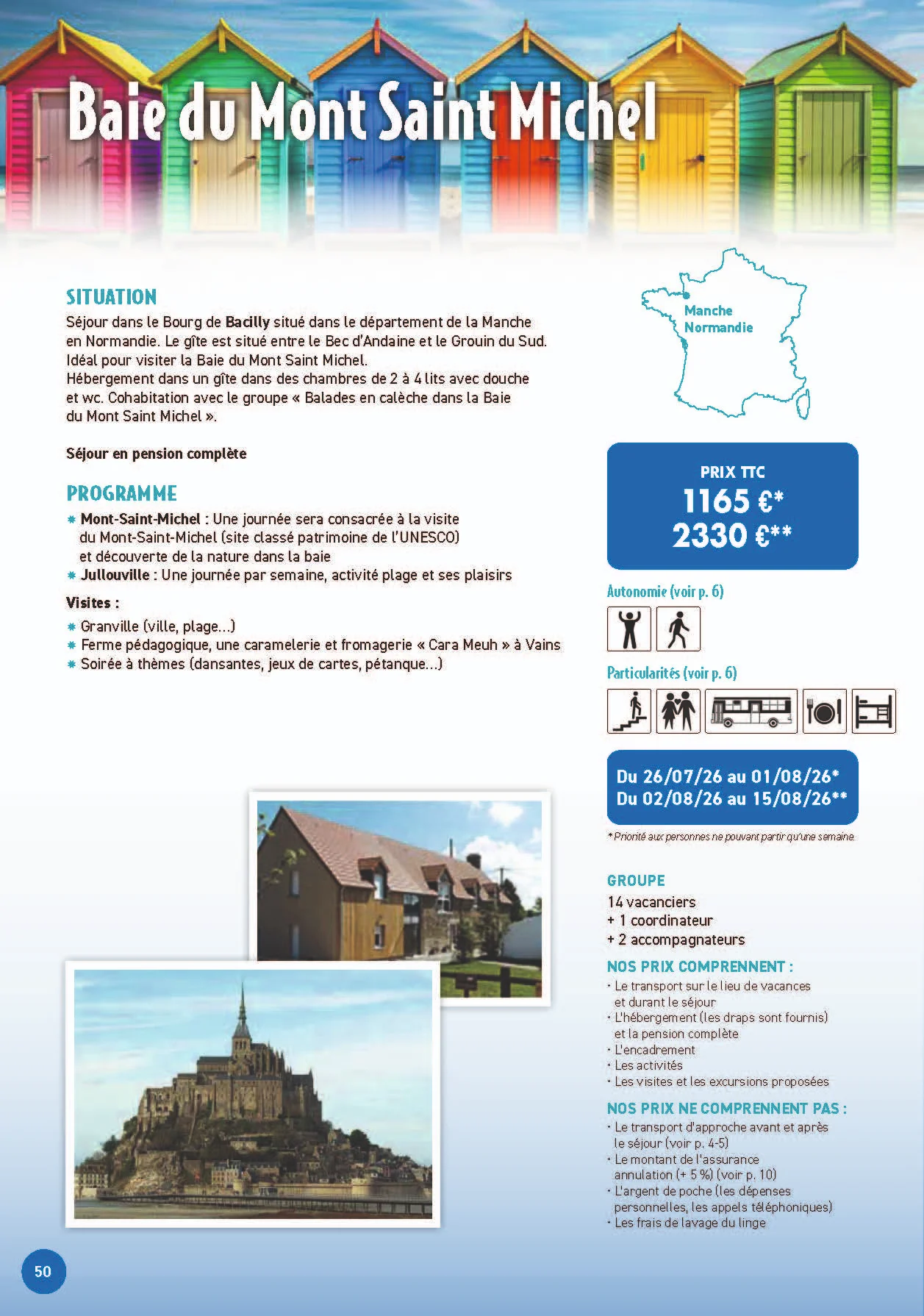 | Baie du Mont Saint Michel | ->1165 €* (Du 26/07/26 au 01/08/26*) ->2330 €** (Du 02/08/26 au 15/08/26**) |