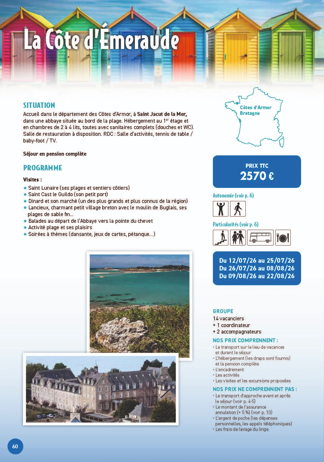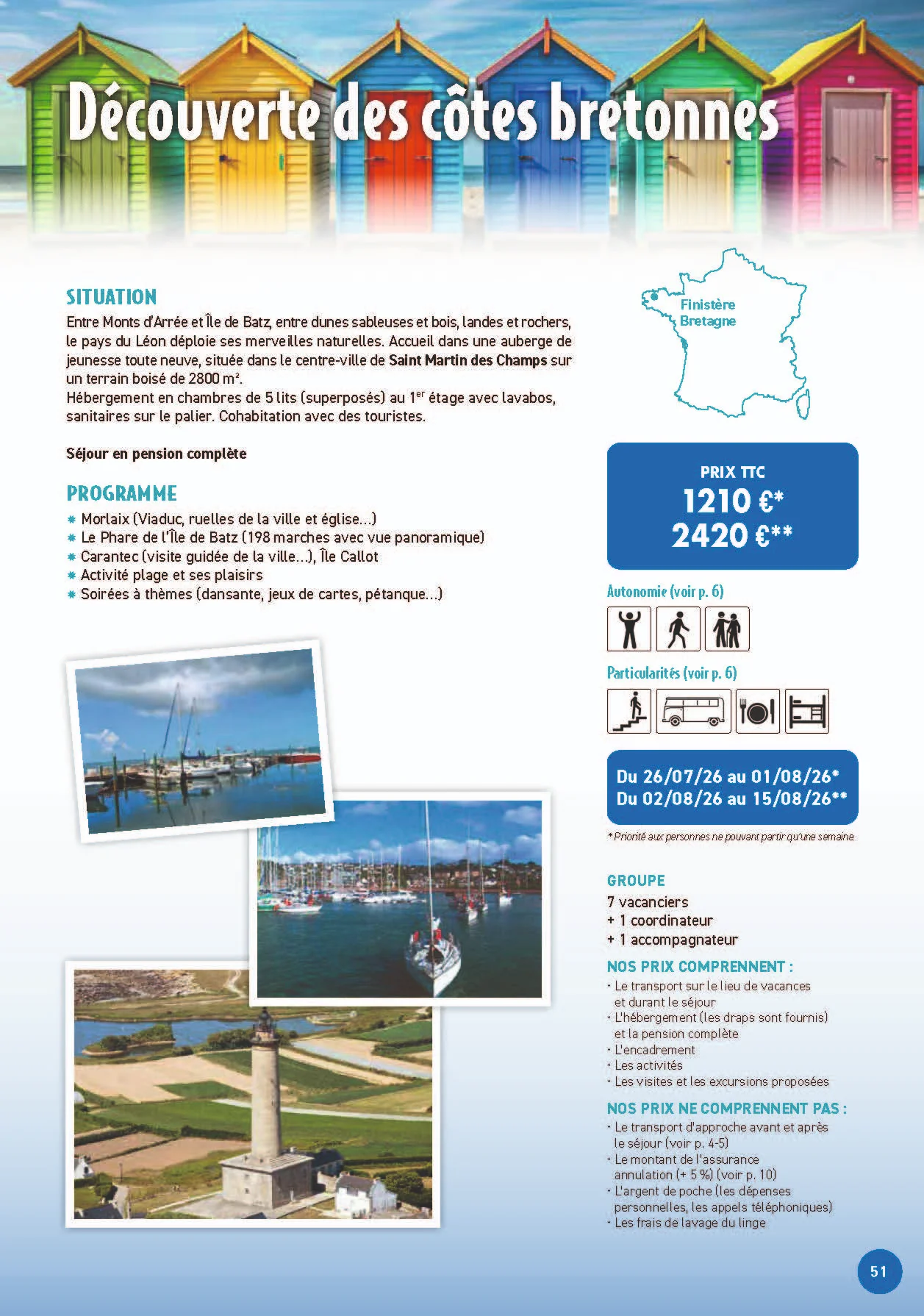 | DECOUVERTE DES COTES BRETONNES | ->1210 €* (Du 26/07/26 au 01/08/26*) ->2420 €** (Du 02/08/26 au 15/08/26**) |
