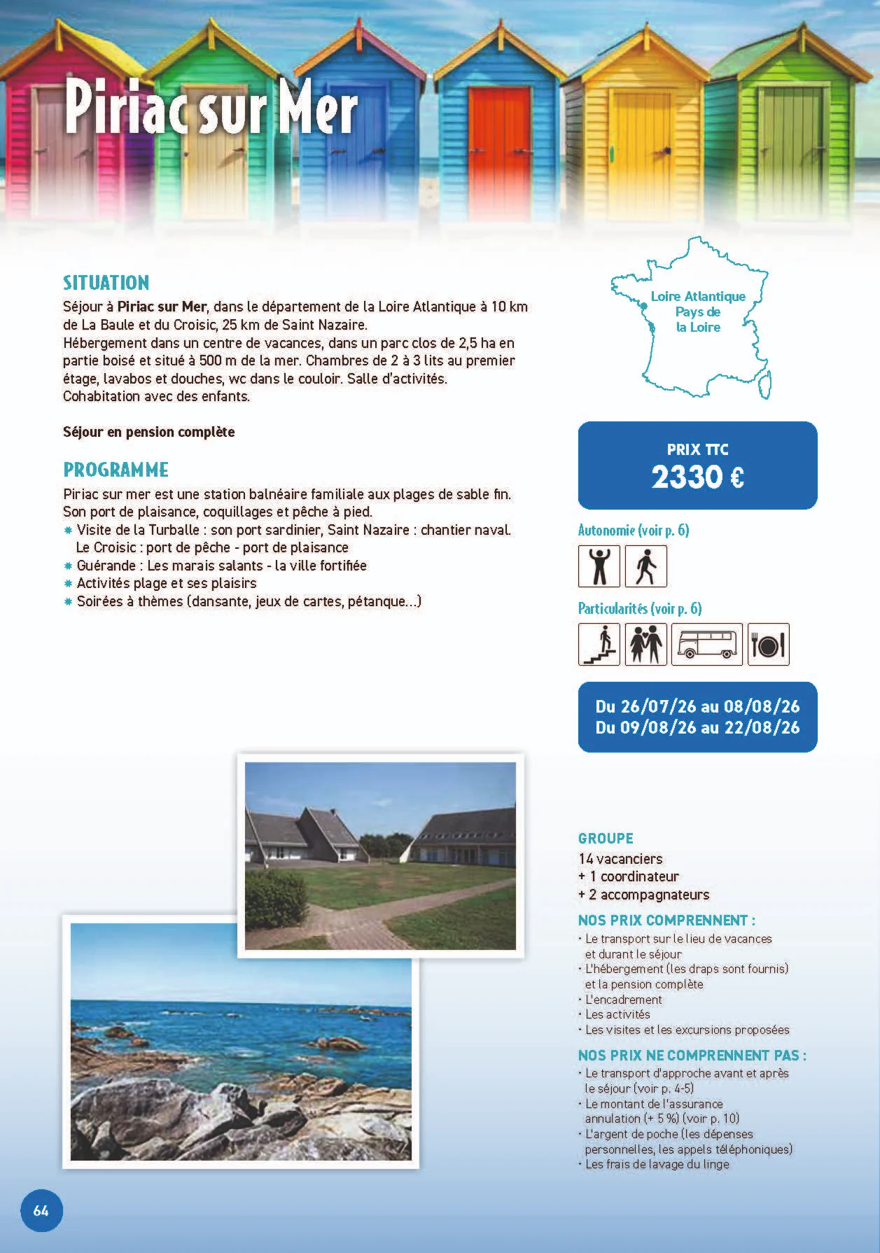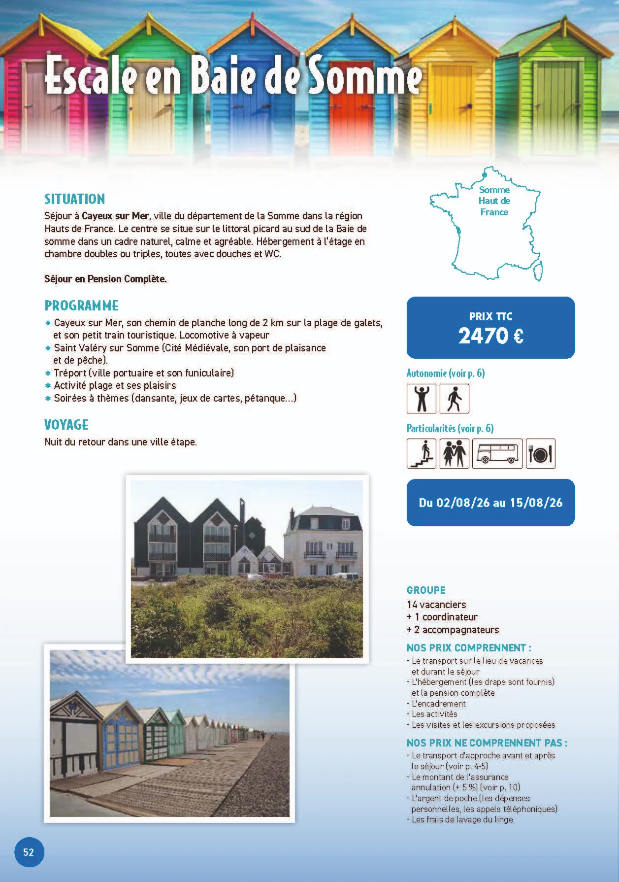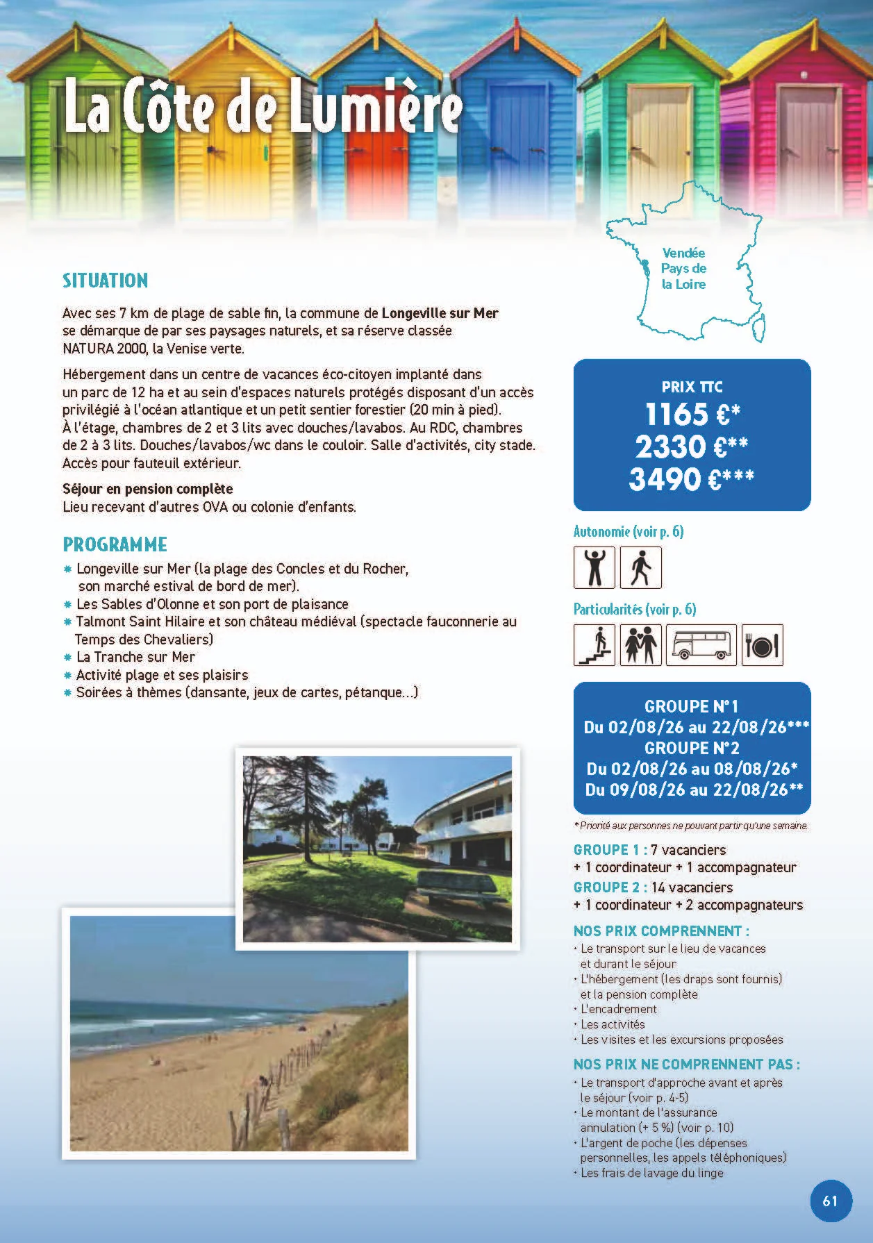 | LA COTE DE LUMIERE | ->1165 €* (GROUPE N°2 Du 02/08/26 au 08/08/26*) ->2330 €** (Du 09/08/26 au 22/08/26**) ->3490 €*** (GROUPE N°1 Du 02/08/26 au 22/08/26***) |