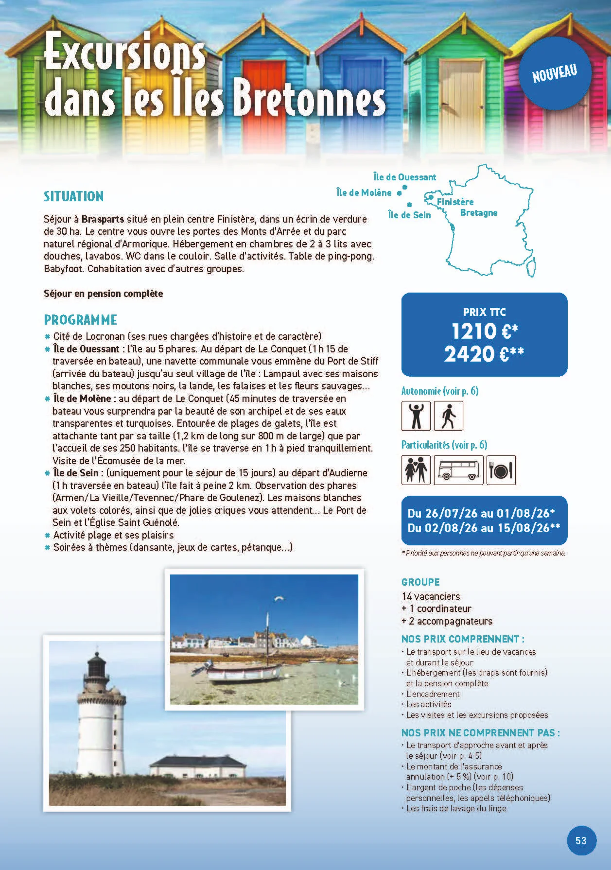 | Excursions dans les lles Bretonnes | ->1210 €* (Du 26/07/26 au 01/08/26*) ->2420 €** (Du 02/08/26 au 15/08/26**) |