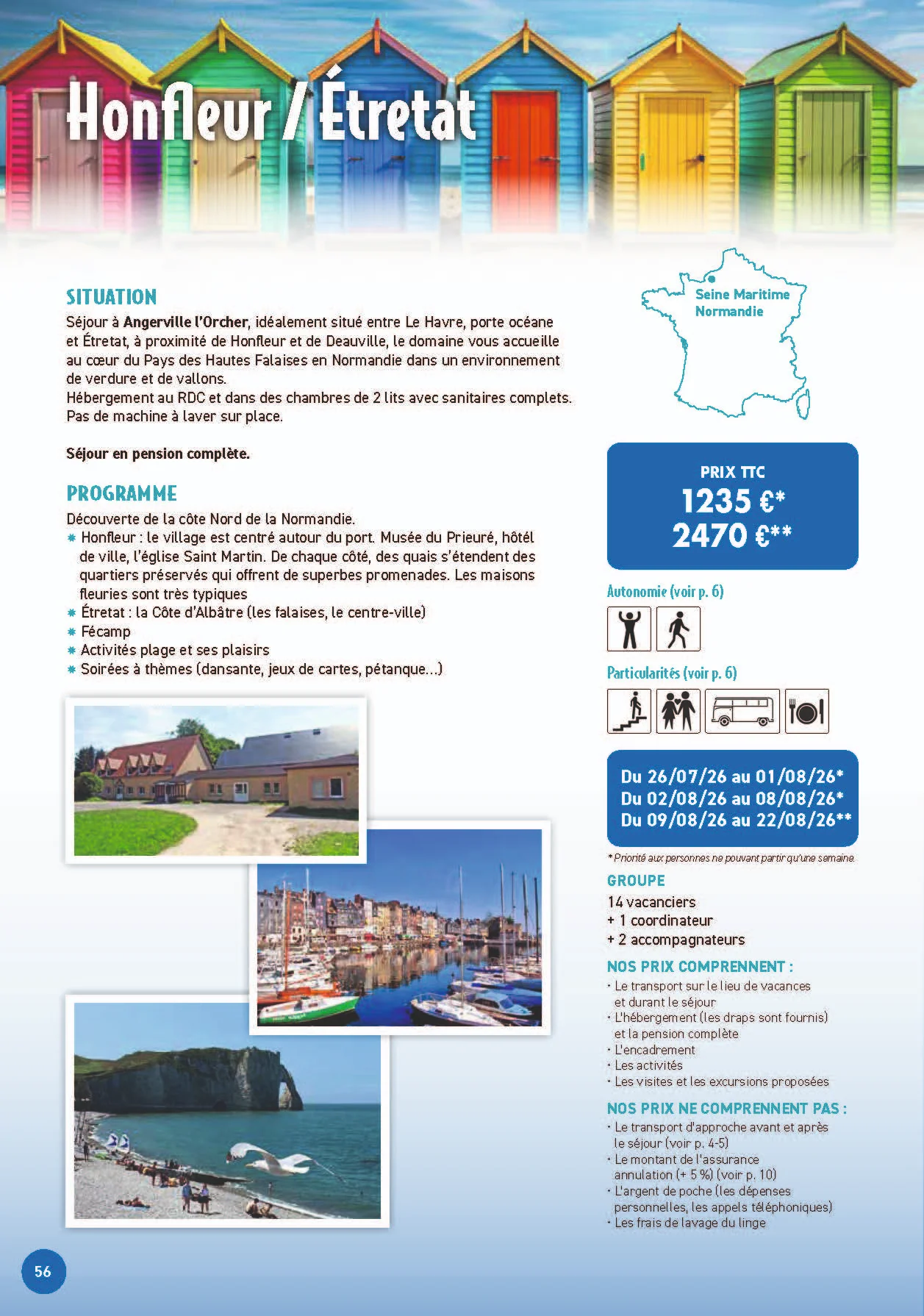| HONFLEUR/ETRETAT | ->1235 €* (pour les dates Du 26/07/26 au 01/08/26* et Du 02/08/26 au 08/08/26*) ->2470 €** (Du 09/08/26 au 22/08/26**) |