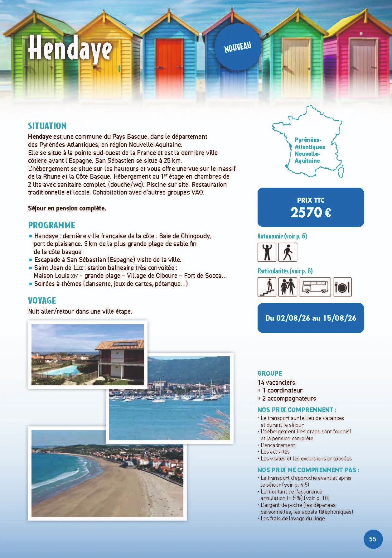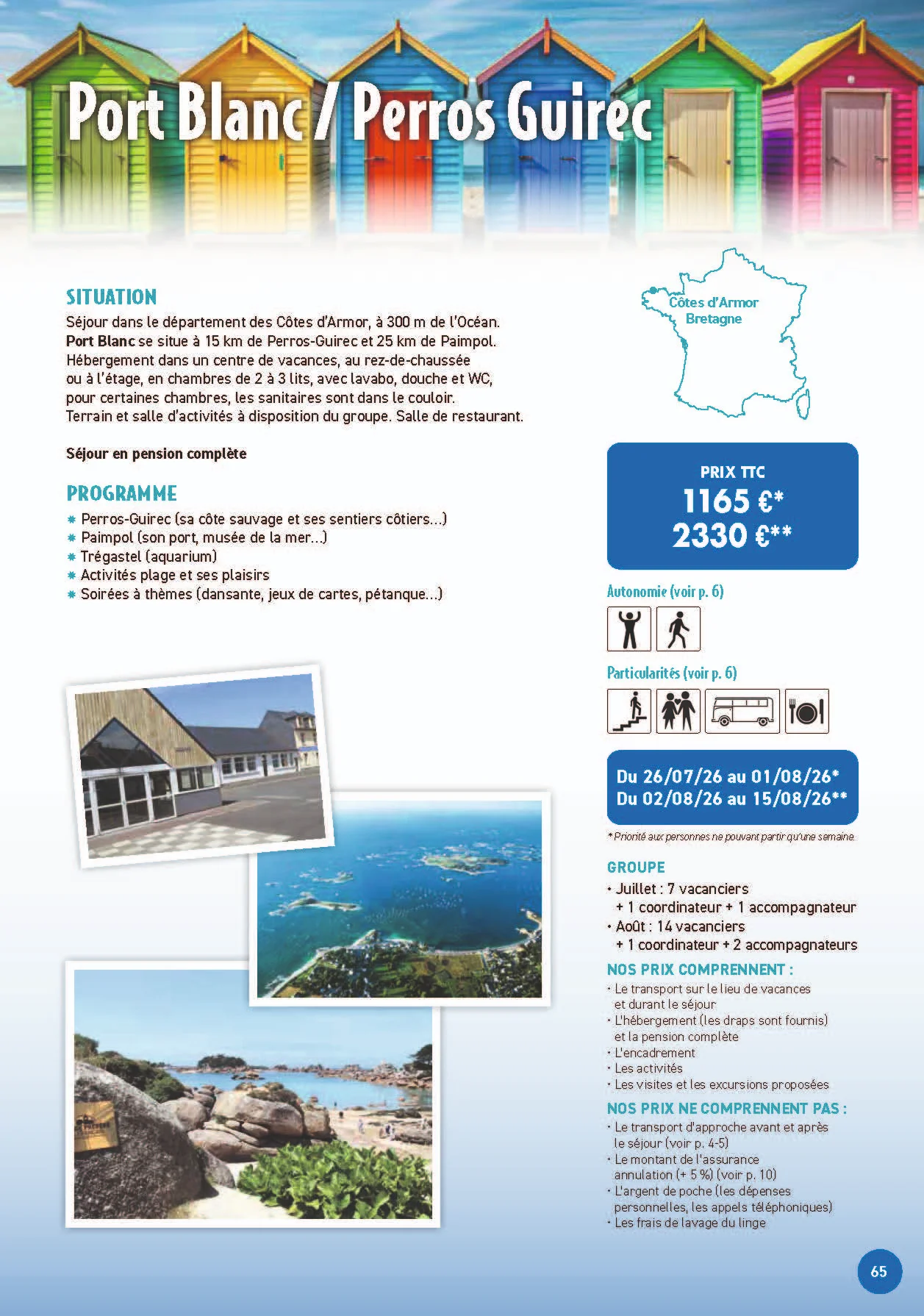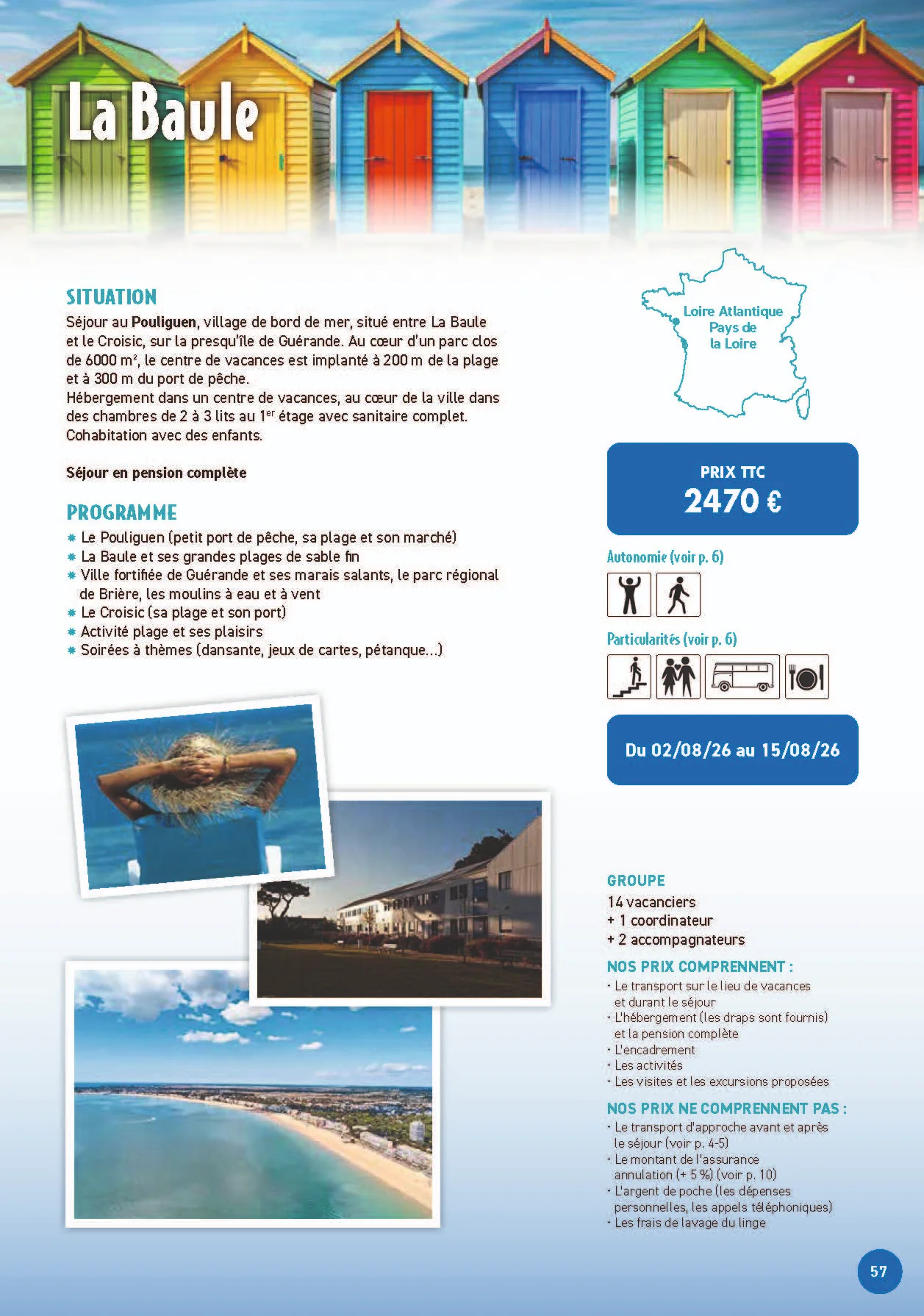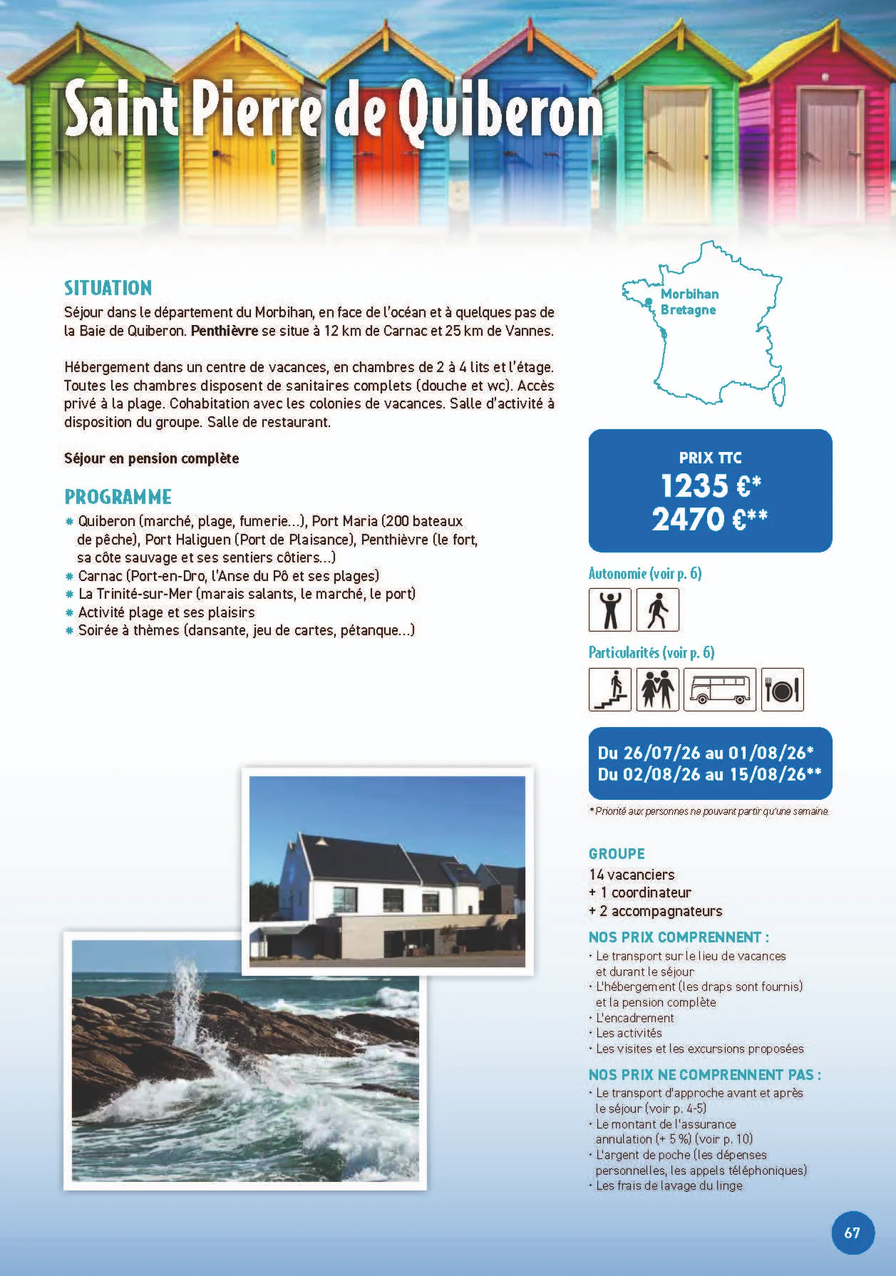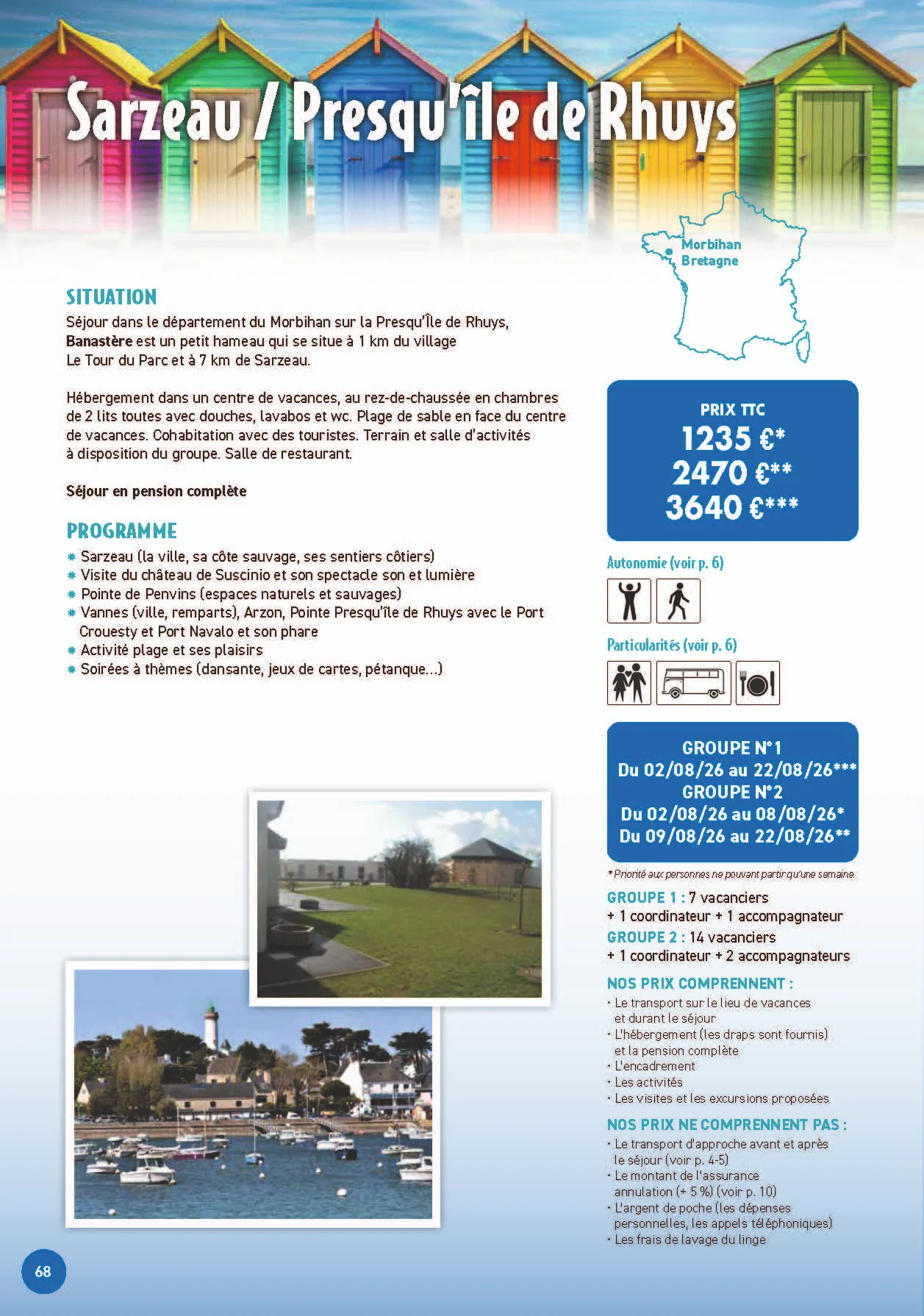 | SARZEAU/PRESQU'ILE DE RHUYS | ->1235 €* (GROUPE N°2 Du 02/08/26 au 08/08/26*) ->2470 €** (GROUPE N°2 : Du 09/08/26 au 22/08/26**) ->3640 €*** (GROUPE N°1 Du 02/08/26 au 22/08/26***) |