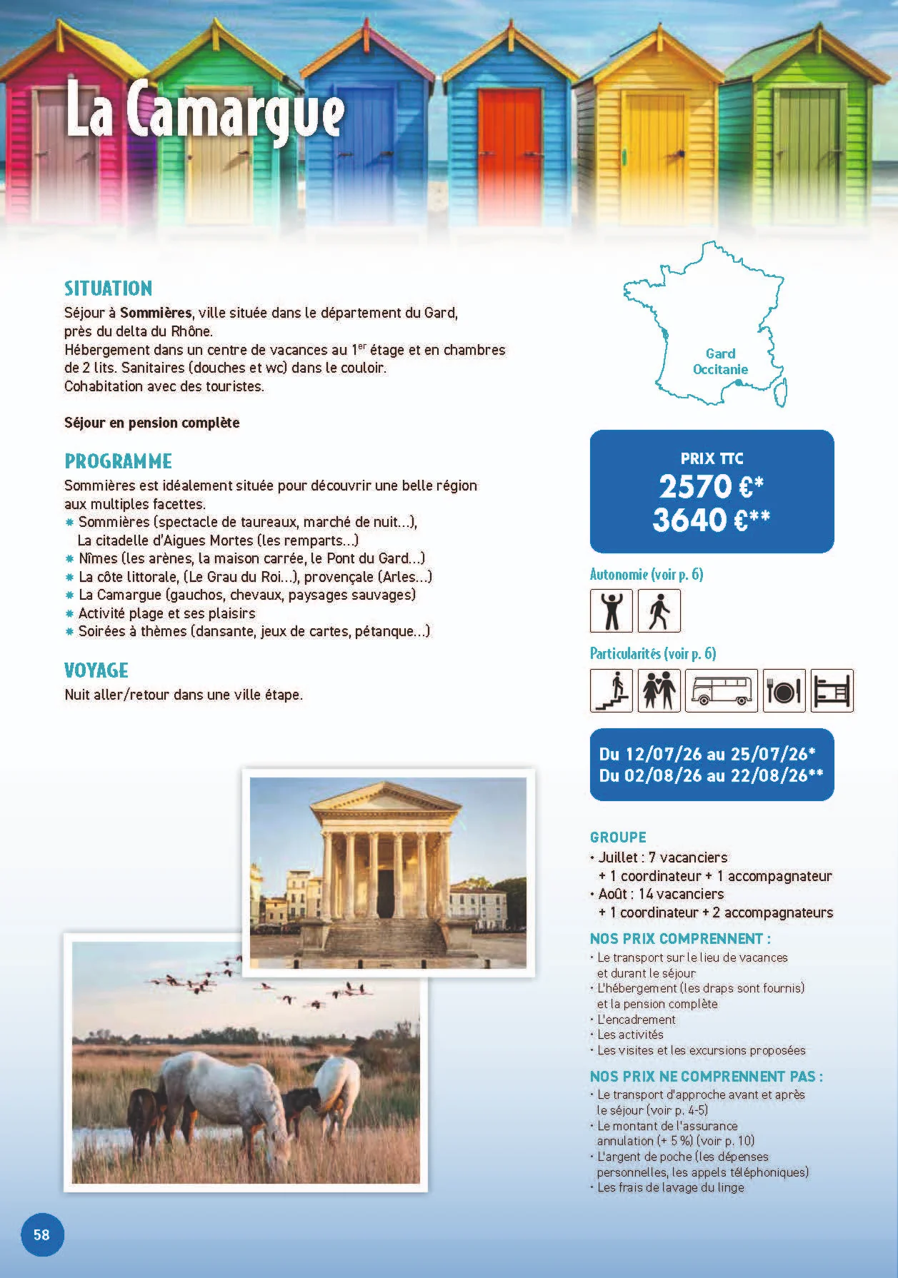 | LA CAMARGUE | ->2570 €* (Du 12/07/26 au 25/07/26*) ->3640 €** (Du 02/08/26 au 22/08/26**) |