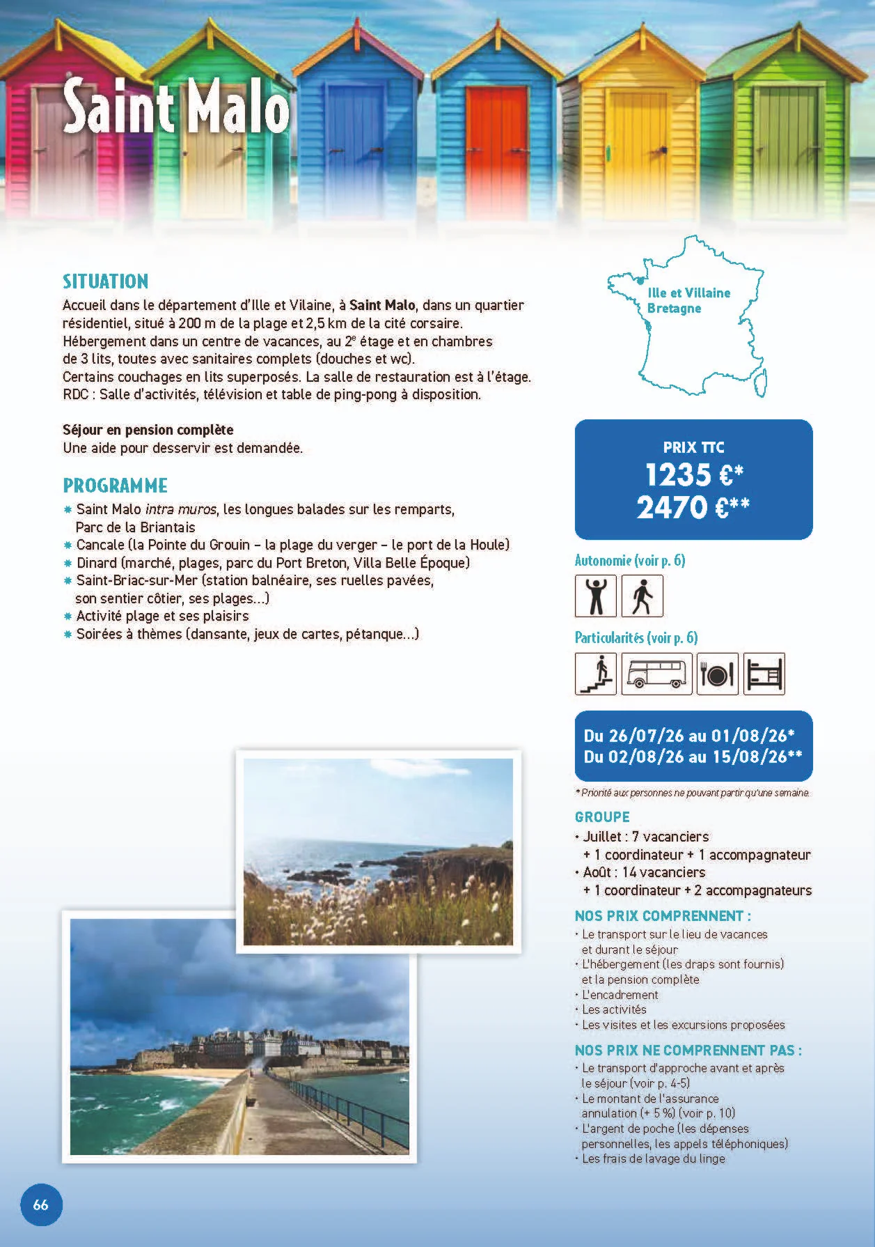 | SAINT MALO | ->1235 €* (Du 26/07/26 au 01/08/26*) ->2470 €** (Du 02/08/26 au 15/08/26**) |