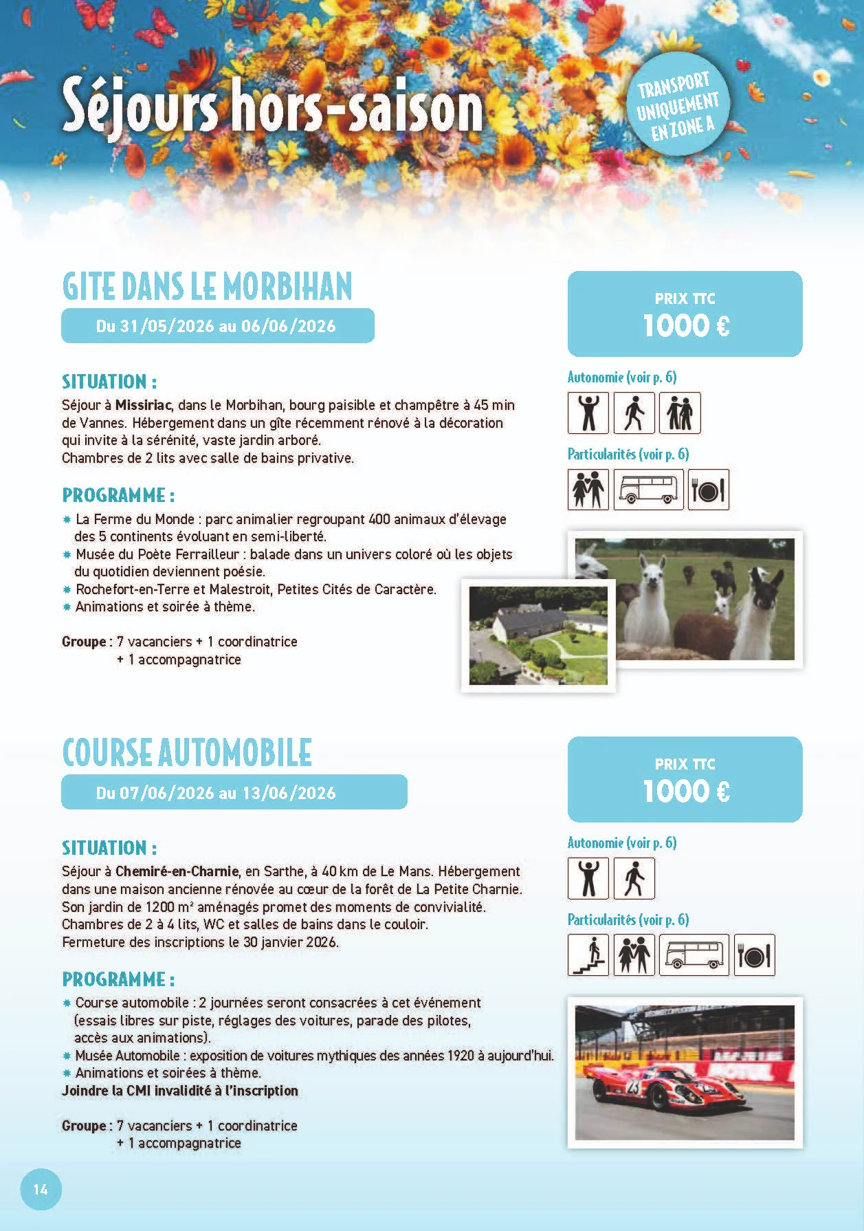 Nos séjours hors-saison vous proposent des expériences variées et enrichissantes. Évadez-vous vers des lieux inspirants, vivez des activités pensées pour vous et créez des souvenirs inoubliables en petit groupe. Chaque escapade est entièrement adaptée aux adultes en situation de handicap, avec un accompagnement attentif du départ au retour.